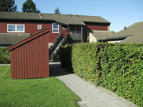 Der er fællesvaskeri, fælleshus og parkeringsplads.